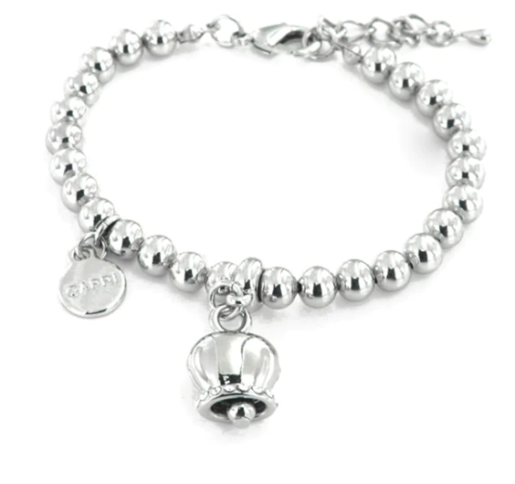 Bracciale in Metallo maglia a sfere, con campanella portafortuna pendente, impreziosita da cristalli Materiali: Metallo Base, Pietra: Cristalli, Galvanica: Placcato Rodio, Varianti o Misura: 17,5+3Cm., Colore: N.D.. Forma: CAMPANELLA.
