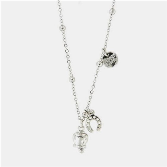 Collana in Metallo con campana pendente e ferro di cavallo Materiali: Metallo Base, Galvanica: Placcato Rodio, Varianti o Misura: CM. 40 + 5, Forma: FERRO DI CAVALLO.