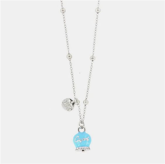 Collana in Metallo con campanella portafortuna pendente impreziosita da smalto turchese e cristalli Materiali: Metallo Base, Pietra: Smalto e cristalli, Galvanica: Placcato Rodio, Varianti o Misura: CM. 50 + 5, Colore: TURCHESE. Forma: CAMPANELLA.