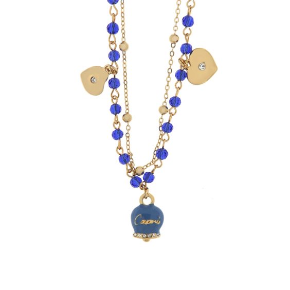 Collana in Metallo multifilo con pietre blu e campanella Capri blu MADE IN P.R.C.. Materiali: Metallo Base, Pietra: smalto e cristalli, Galvanica: Placcato Oro, Varianti o Misura: 45+5cm., Colore: BLU.