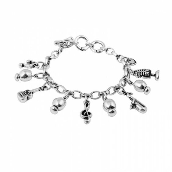 Bracciale da donna CICLÒN realizzato a mano in metallo argentato, dedicato alla musica. Ha diversi ciondoli: una nota musicale, una chitarra, una chiave di violino, un sax, un microfono, 4 charm pendenti tipo pepite.