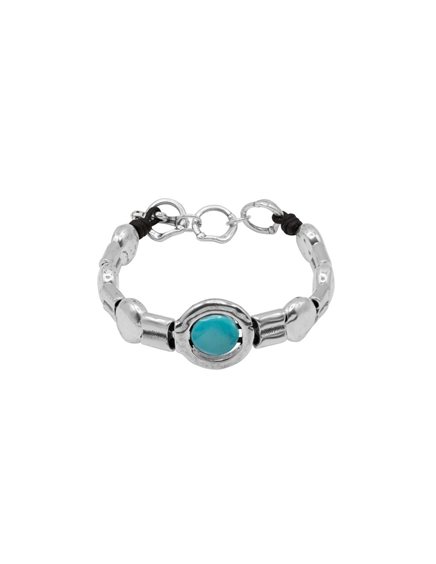 Bracciale in pelle con piccoli dettagli rotondi argentati e motivo centrale in vetro di Murano. Chiusura a T, regolabile da 17 a 20 cm.