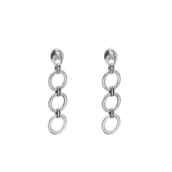 Orecchini placcati in argento con tre semplici cerchi lunghi 6 cm e chiusura a pressione.