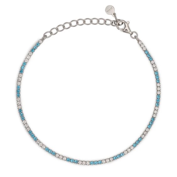 Bracciale in Argento 925 con zirconi turchese e bianchi alternati Misura: 17+3 cm Diametro: 1,5 mm Colore: Silver, Argento 925 Materiale: Argento 925 Pietra: Zircone Colore pietra: Turchese e Bianco Modello: Tennis 3+3