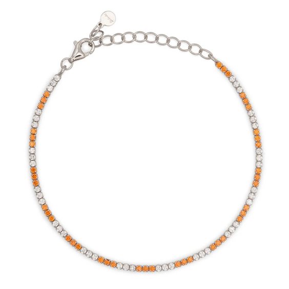 Bracciale in Argento 925 con zirconi arancioni e bianchi alternati Misura: 17+3 cm Diametro: 1,5 mm Colore: Silver, Argento 925 Materiale: Argento 925 Pietra: Zircone Colore pietra: Arancione e Bianco Modello: Tennis 3+3