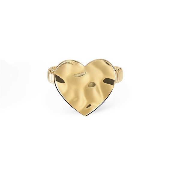 Anello dorato con elemento a forma di cuore effetto martellato. • Dimensioni anello tubogas: 4 x 2 mm • Dimensioni cuore: 17 x 16 mm • Materiale: Acciaio 316L, Acciaio 304, PVD Giallo