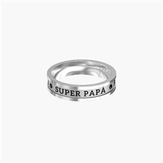 Anello in acciaio 316L lucido e satinato, misura 19, cristallo nero. Scritta: SUPER PAPÀ. Dimensioni: cristallo Ø 1.5 mm