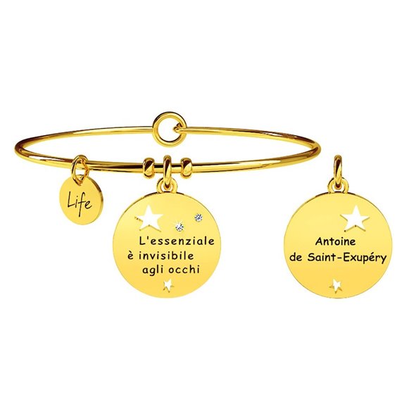 Bracciale rigido Kidult in acciaio 316L GOLD PVD da donna con frase filosofica riportata su un ciondolo rotondo decorato con zirconi e incisioni a forma di stella. L’essenziale è invisibile agli occhi” – A. de Saint-Exupèry –