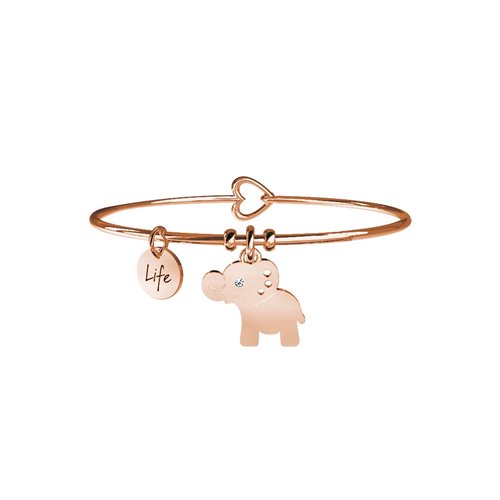Bracciale rigido Kidult in acciaio 316L rose gold pvd, con ciondolo a forma di elefante e cristallo. 'Forza, intelligenza e incredibile memoria, può sollevare monti e cambiare la storia. Chi lo indossa per sempre fortunato sarà e il desiderio di gloria forse si avvererà.'