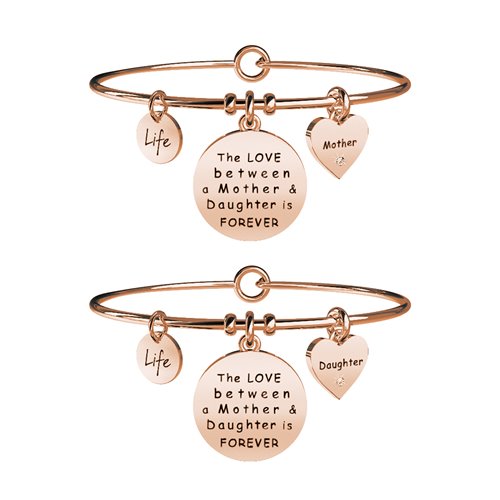 Set di due bracciali rigidi Kidult in acciaio 316L rose gold pvd con un ciondolo rotondo e frasi incise, uno per la mamma e uno per la figlia, e un ciondolo a forma di cuore con zircone.Ciascuno dei due bracciali del set riporta incisa la frase: “The LOVE between a Mother and a Daughter is FOREVER”.“E’ un amore profondo che resiste a tutte le intemperie della vita. Anche distanti per mesi o per ore, il nostro legame durerà per sempre.”Il 20% del ricavato dalla vendita di questo bracciale verrà devoluto da Kidult alla Onlus Pangea, a sostegno del progetto “Piccoli Ospiti”.
