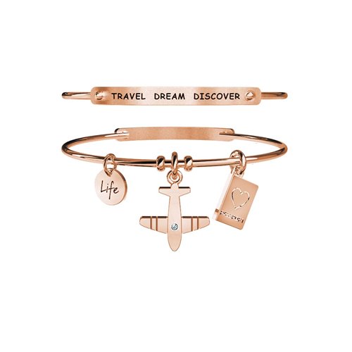 Bracciale rigido Kidult in acciaio 316L rose gold pvd con doppio ciondolo: uno a forma di aereo con cristallo e un altro ciondolo a forma di passaporto . “In volo sulle ali dell’entusiasmo, ogni timbro sul passaporto una bandierina sulla mappa della vita. La meta non importa, quello che conta è il viaggio!”