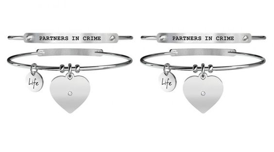 Due bracciali in acciaio 316L ipoallergenico con ciondolo a cuore impreziosito da zirconcino al centro. Chiusura con targhetta 'Partners in crime'.'Se l’amicizia fosse un crimine, noi saremmo le fuorilegge più ricercate al mondo. Io e te, amiche per sempre.'