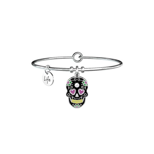 Bracciale bangle in acciaio 316L, circonferenza 20 cm, Ø 6 cm con ciondolo smaltato teschio messicano, cristallo bianco. Dimensioni: ciondolo 14x20 mm, cristallo Ø 2 mm