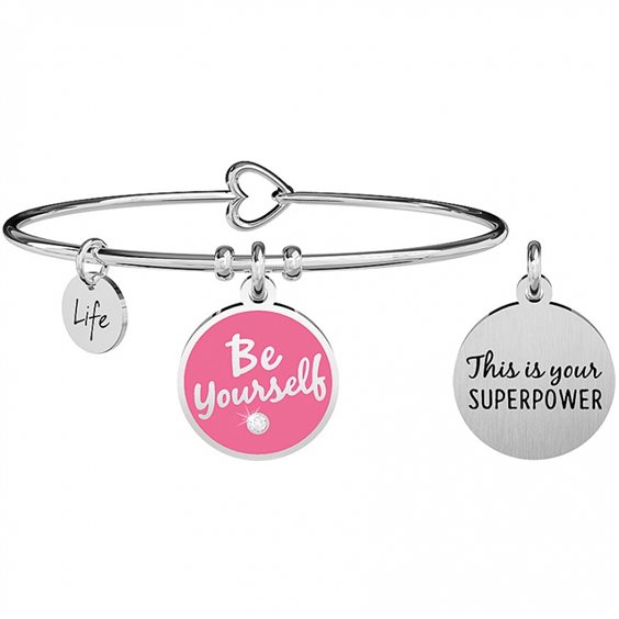 Bracciale Da Donna Della Collezione Philosophy. Bangle In Acciaio Con Ciondolo Tondo Smaltato Rosa. Gioiello Con Smalto Colorato E Cristallo Sul Ciondolo. Materiale: Acciaio 316L, Smalto, Cristallo. Gioiello Con Chiusura A Cuore. Misura Unica, Diametro 6 Cm.