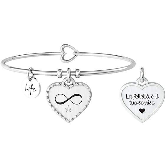 Bracciale bangle in acciaio 316L, circonferenza 20 cm, Ø 6 cm con ciondolo satinato e bordo in acciaio lucido con borchie, smalto, cristallo bianco. Scritta: La felicità è il tuo sorriso. Dimensioni: ciondolo 19x19, cristallo Ø 1.75