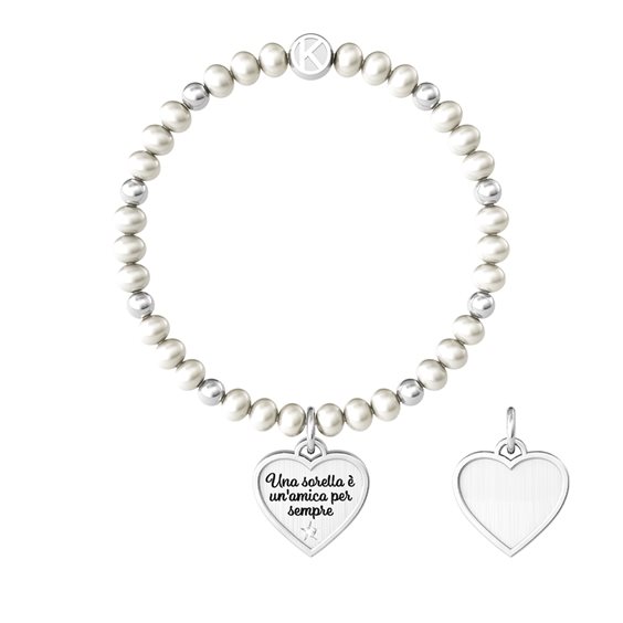 Bracciale elastico in acciaio 316L con perla coltivata, circonferenza 17.5 cm, ciondolo cuore lucido e satinato, cristallo. Scritta: Una sorella è...sempre. Dimensioni: ciondolo 17x17, perle Ø 4.5-5 mm, cristallo Ø 1.5 mm