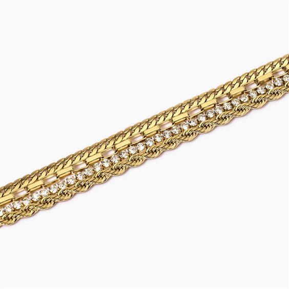 Bracciale regolabile in acciaio dorato con tre catene e tennis di cristalli bianchi. • Dimensione catena corda: 4 mm • Dimensione catena groumette: 3 mm • Dimensione catena allungata: 2,5 mm • Diametro cristalli: 2 mm • Misura regolabile, lunghezza da 16 a 19 cm • Materiale: Acciaio 316L, Cristalli, PVD giallo