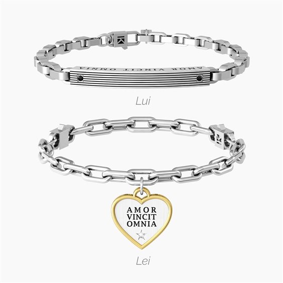 Coppia di bracciali con catena e frase amor vincit omnia.