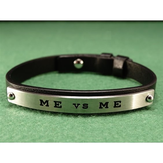 Bracciale in pelle nera e piastra in acciaio satinato con incisione Me Vs. Me misura regolabile 17/19.5 cm.