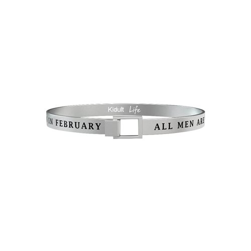 Bracciale in acciaio e smalto nero, con frase 'All men are created equal, but only the best are born in February'.