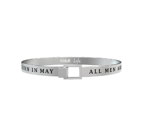 Bracciale in acciaio e smalto nero, con frase 'All men are created equal, but only the best are born in August'.