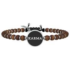 Bracciale Kidult Spirituality Karma, composto da un cordino nero su cui sono montate piccole rondelle di legno e targhetta tonda black pvd con inciso la scritta “Karma“.