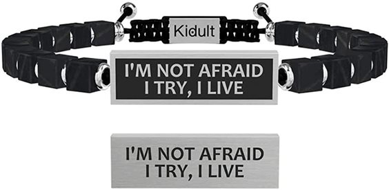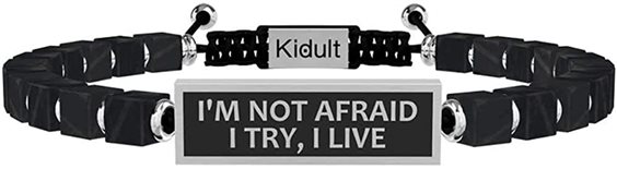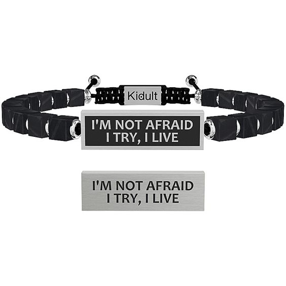 Bracciale Da Uomo Di Kidult Della Collezione Philosophy. Bracciale Con Cubi In Onice E Piastra Rettangolare In Acciaio Di Colore Nero... La Frase Incisa È: I'M Not Afraid I Try, I Live. Materiale: Acciaio 316L Con Pvd Nero, Onice, Nylon. Gioiello Con Chiusura Con Cordino. Misura Regolabile, Diametro Da 6 A 8 Cm. La Referenza È 731786 Questo bracciale verrà spedito con Scatola Originale Kidult