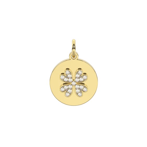 Ciondolo in acciaio 316L e PVD giallo con soggetto quadrifoglio e cristalli. Dimensioni: ciondolo Ø 15 mm, quadrifoglio 9x9 mm, cristalli Ø 1.25 mm