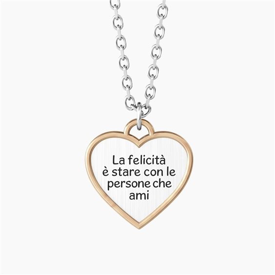 Collana in acciaio 316L, lunghezza 80 cm con catena groumette e ciondolo cuore satinato e con PVD rosé lucido. Scritta: La felicità è... FAMIGLIA. Dimensioni: catena 1.8 mm, ciondolo 19.40x19.9 mm