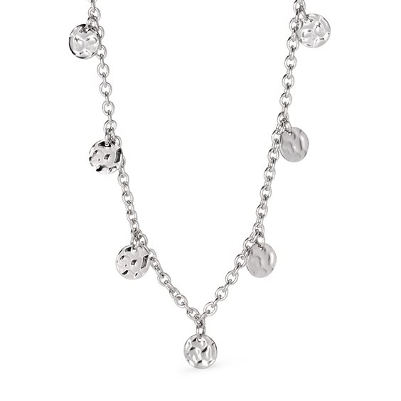 Girocollo regolabile con elementi pendenti effetto martellato. • Dimensione catena: 3 mm • Diametro pendente: 8 mm • Misura regolabile, lunghezza da 38 a 43 cm • Materiale: Acciaio 316L