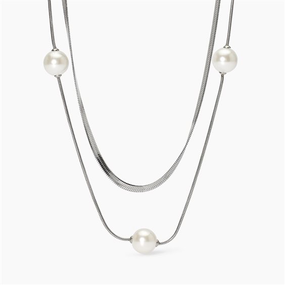 Collana in acciaio con catena herringbone e snake con perle conchiglia. • Dimensione catena herringbone: 3 mm • Dimensione catena snake: 1,2 mm • Diametro perle conchiglia: 10 mm • Misura unica, lunghezza 80 cm • Materiale: Acciaio 316L, Perle conchiglia