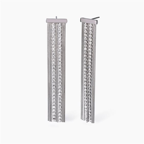 Orecchini pendenti con catena snake e tennis di cristalli bianchi. • Lunghezza orecchino: 10,5 cm • Larghezza orecchino: 1 mm • Diametro cristalli: 2 mm • Materiale: Acciaio 316L, Cristalli