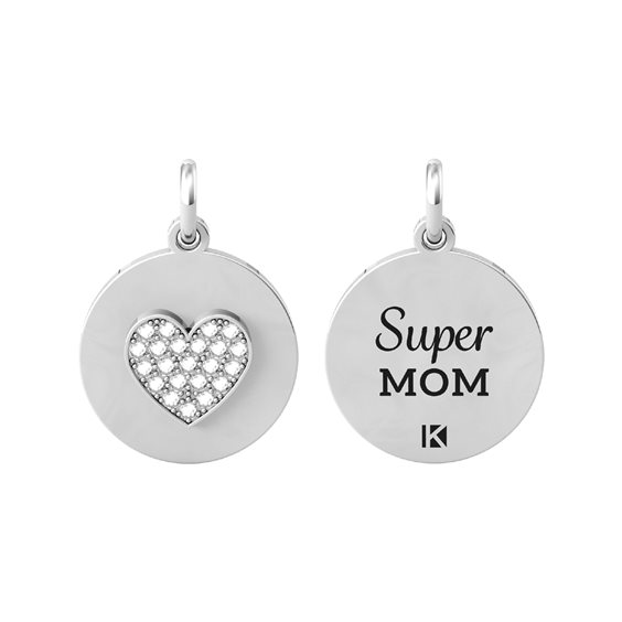 Ciondolo in acciaio 316L con elemento a cuore e cristalli bianchi. Scritta: Super MOM. Dimensioni: ciondolo Ø 15 mm, cuore 8.5x8 mm, cristalli Ø 1.25 mm