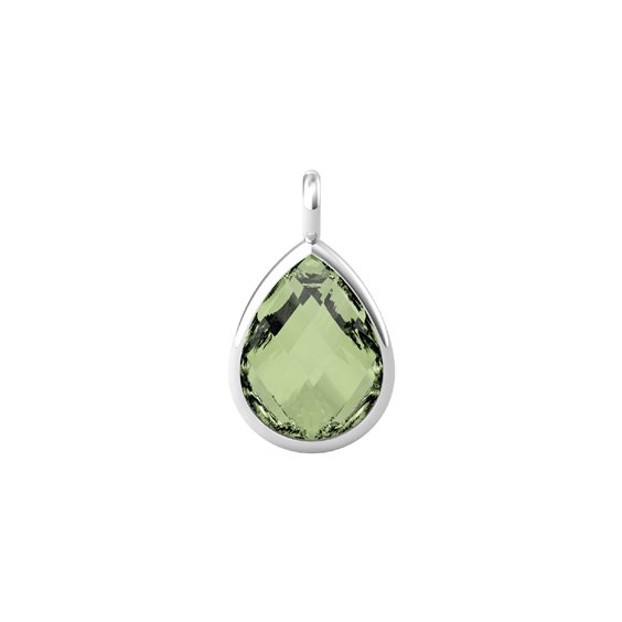 Ciondolo in acciaio 316L taglio goccia con glass verde faccettato taglio briolette. Dimensioni: ciondolo Ø 10.5x14 mm