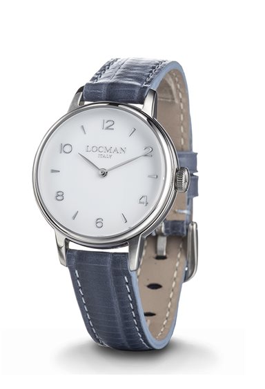 Orologio donna , cassa in acciaio 316L , movimento al quarzo , solo tempo , quadrante bianco , indici e lancette acciaio , vetro minerale antigraffio con trattamento zaffiro , fondello a pressione , numero seriale di produzione inciso sul fondo , cinturino in pelle stampata azzurra. Immagine indicativa , la confezione può variare di forma e colore , scatola e garanzia originali.
