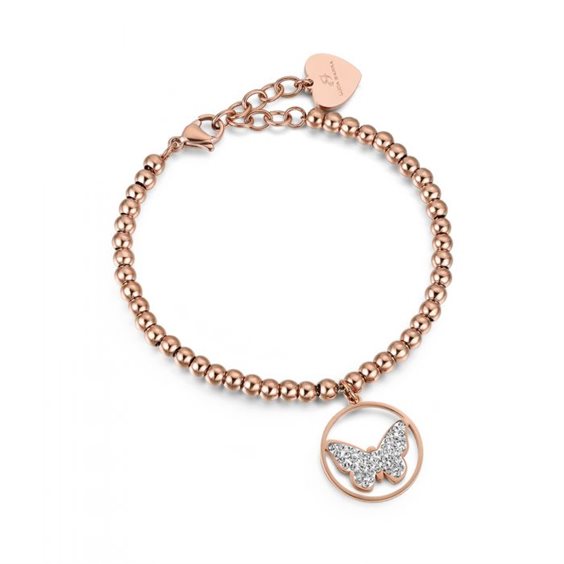 Bracciale Donna Luca Barra in acciaio rosé con farfalla con cristalli bianchi. Lunghezza: 16 + 3 cm Diametro ciondolo: 18 mm