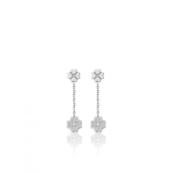Orecchini in acciaio con quadrifogli con glitter bianco. Lunghezza: 4 cm
