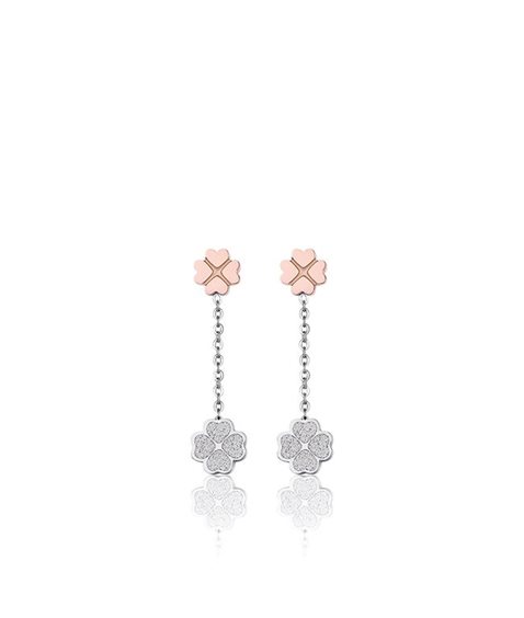 Orecchini in acciaio con quadrifogli rosè e glitter bianco. Lunghezza: 4 cm