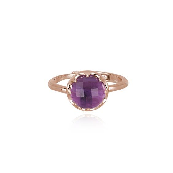 Anello in argento rosato con ametista a taglio rotondo. • Incastonatura dell'ametista a griffe • Diametro dell'ametista: 9 mm • Misura regolabile, dalla 11 alla 19 • Materiale: Argento 925 rosato, Ametista • Designed by Mabina in Italy