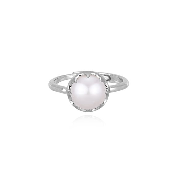 Anello in argento con perla a bottone coltivata. • Incastonatura della perla a griffe • Diametro della perla: 8,5/9 mm • Misura regolabile, dalla 11 alla 19 • Materiale: Argento 925, Perla coltivata • Designed by Mabina in Italy