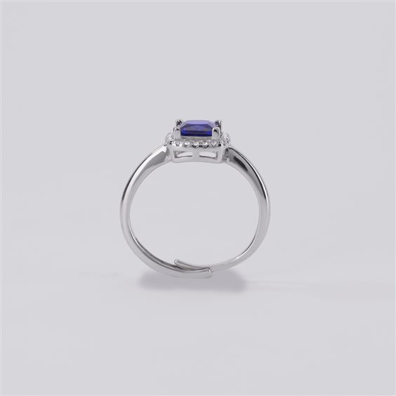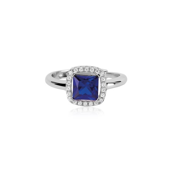 Anello in argento con zaffiro sintetico taglio cuscino antico e zirconi. • Incastonatura dello zaffiro sintetico a griffe a quattro punte • Dimensione dello zaffiro sintetico: 6x6 mm • Diametro degli zirconi: 1 mm • Misura regolabile, dalla 11 alla 19 • Materiale: Argento 925, Zaffiro sintetico, Zirconi