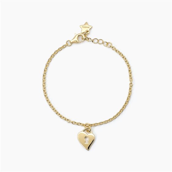 Bracciale bimba in argento dorato con ciondolo con a forma di cuore con lucchetto. • Chiusura con moschettone • Misura regolabile, lunghezza da 15 a 17 cm • Materiale: Argento 925 dorato