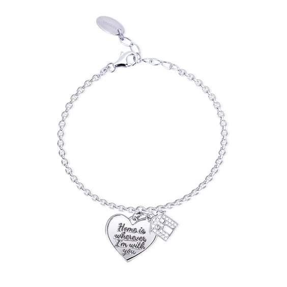 Bracciale donna , argento 925% rodiato , catena maglia rolò , lunghezza cm 19 regolabile fino a cm 16 , cuore pendente cm 2 , casetta pendente , zirconi bianchi incastonati con griffe. Immagine indicativa , la confezione può variare di forma e colore.