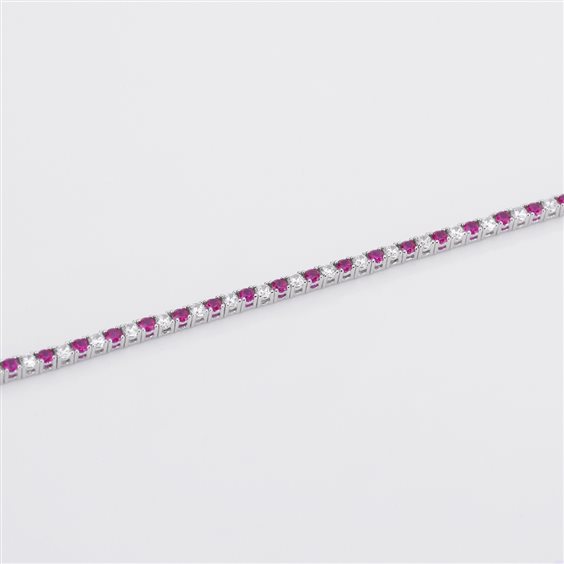 Bracciale tennis in argento 925 rodiato, rubini sintetici e zirconi bianchi alternati. Chiusura pinza a molla. Misura cm 18.