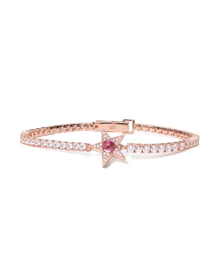 Bracciale Tennis Mabina in argento 925 color oro rosa con stella. Al centro della stellina un corindone sintetico rosa/fucsia contornato da zirconi bianchi. Gli zirconi bianchi del bracciale hanno un diametro di 2,5 mm. Questo gioiello fa parte della collezione sponsorizzata dai concorrenti di X Factor 2022 (X Factor Mabina Gioielli). La pietra rosa misura 4 mm, mentre gli zirconi all’interno della stella hanno un diametro di 1 mm. Questo bracciale è disponibile nella misura S (16 cm) e M (18 cm): scegli la tua! La chiusura del tennis è a molletta ed è infatti comodo e semplice da indossare