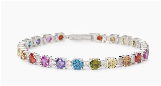 Bracciale tennis in argento 925/°°° rodiato con tormalina rosa e acquamarina sintetiche, zirconi multicolor Ø 5 e bianchi Ø 2.5 mm, lunghezza 17 cm