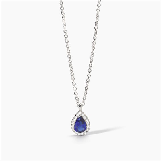 Girocollo in argento 925/°°° rodiato con catena forzatina 1.5 mm, zaffiro sintetico taglio goccia 5x7 e zirconi bianchi Ø 1.3 mm, lunghezza regolabile da 40 a 45 cm