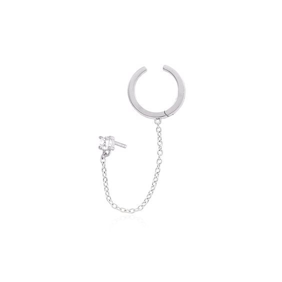 Monorecchino ear cuff a cerchio in argento con catenella e punto luce in zircone a lobo. • Incastonatura dello zircone a griffe a quattro punte • Chiusura a scatto • Misura unica • Materiale: Argento 925, Zirconi
