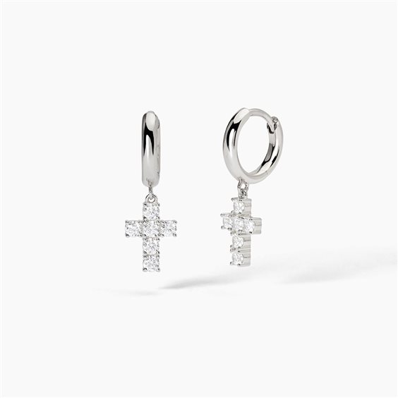 Orecchini da donna in argento rodiato con ciondolo croce e zirconi bianchi. • Dimensione croce: 8 x 11 mm • Diametro zirconi: 2,5 mm • Diametro esterno del cerchio: 12,5 mm • Lunghezza tot. orecchino: 2,5 cm • Materiale: Argento 925, Zirconi