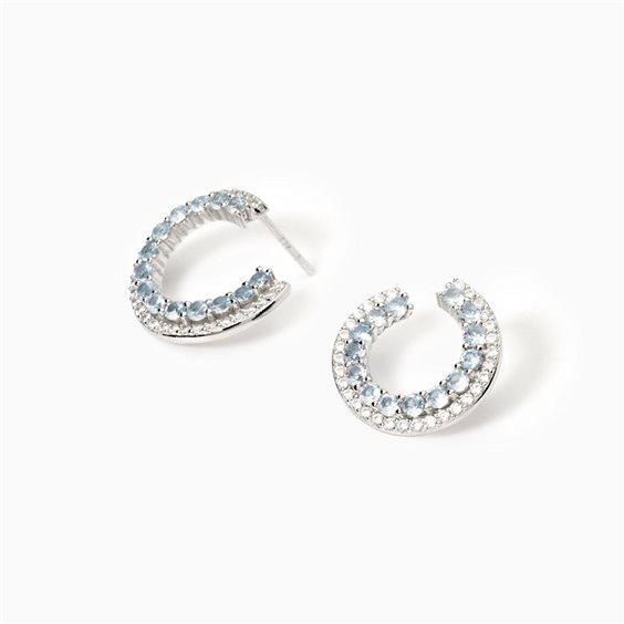 Orecchini da donna a cerchio in argento rodiato con acquamarina sintetica e zirconi. • Diametro acquamarina sintetica: 2.25 mm • Diametro interno del cerchio: 10 mm • Diametro esterno del cerchio: 17 mm • Diametro degli zirconi: 1.25 mm • Lunghezza tot. orecchino: 1.7 cm • Materiale: Argento 925, Acquamarina sintetica, Zirconi